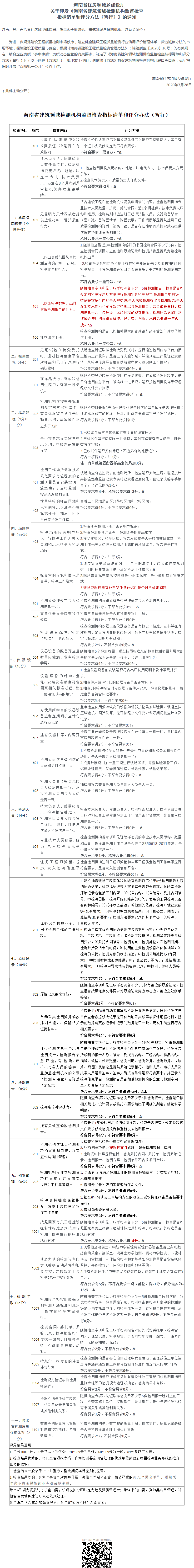 海南省住房和城鄉(xiāng)建設廳關于印發(fā)《海南省建筑領域檢測機構(gòu)監(jiān)督檢查指標清單和評分方法(暫行)》的通知